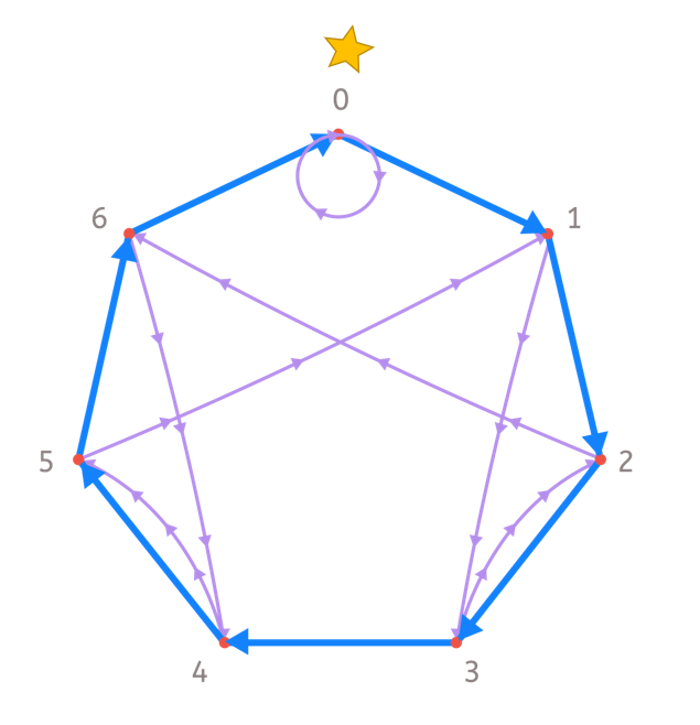 First, we place the possible remainders at the vertices of a heptagon (a 7-sided figure). Then, we join them with blue arrows oriented in the direction that the remainders are occurring. Now, with purple arrows, we join each of the remainders with the remainder of the number that is the result of multiplying it by 10. For example, 3 is joined to 2 with a purple arrow, as 3 x 10 = 30 and the remainder of dividing 30 by 7 is 2. With this information, we have obtained the following graph: