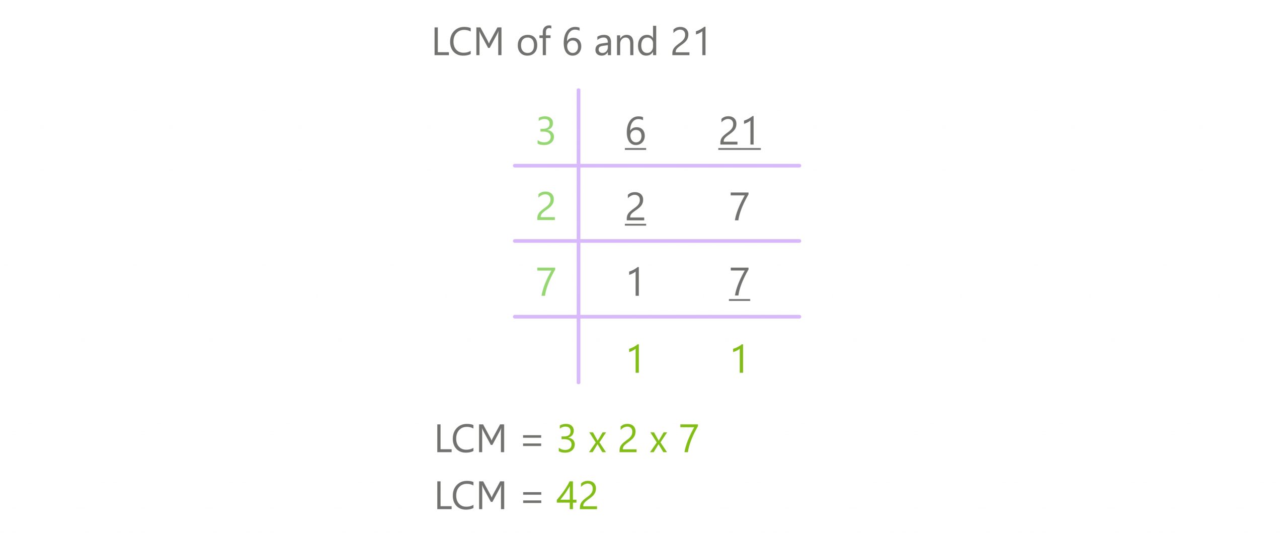 Multiply those friendly divisors: LCM (6, 21) = 3 x 2 x 7 = 42